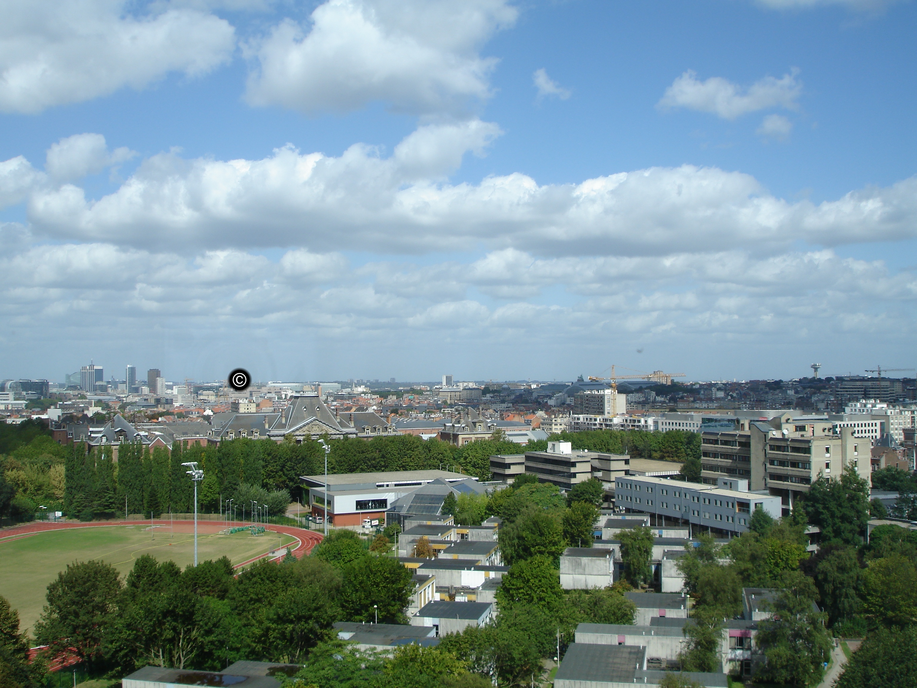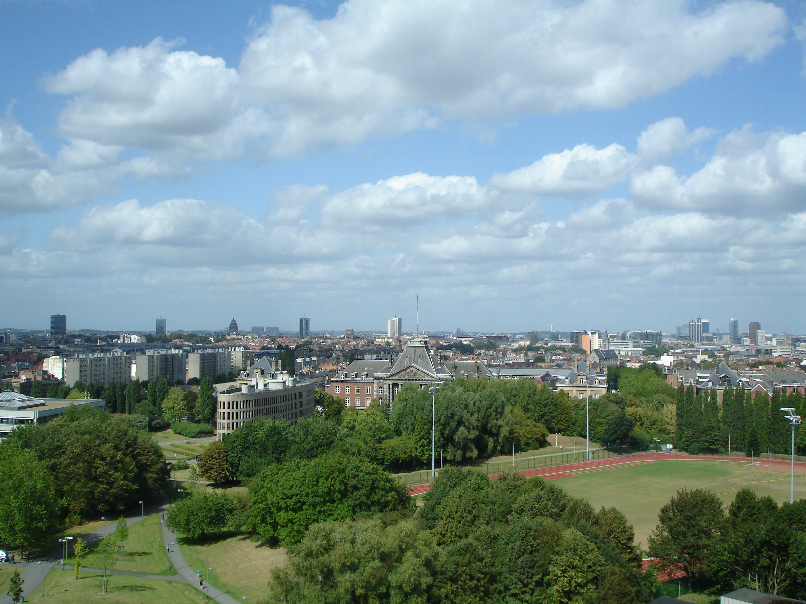 The Vrije Universiteit Brussel's Department of Computer Science is housed on the tenth floor of the university's F and G buildings. Though they may once have been admired as striking examples of brutalist architecture, most people nowadays have a less positive attitude towards these enormous structures of poured concrete. Nonetheless, our offices enjoy a spectacular view of Brussels, as evidenced by the pictures below. The left picture shows, among others and from left to right, the South Tower, the Palace of Justice, the Basilica of the Sacred Heart, the European Parliament, and Brussels's business district. The right picture shows, among others, Brussels's business district, the Atomium ©, the Berlaymont (which houses the European Commission), the Cinquantenaire, and the VRT Tower.